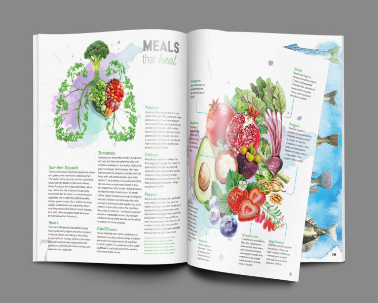 The goal of this project was to recreate an existing magazine with a new look and feel for a different demographic. The goal was to showcase a magazine layout and design that embodied the spirit, needs, and personal style of a mid-millennial woman and what she values most with respect to health and wellness information. I used photo-montage for many of the images, as well as hand painted watercolor elements.